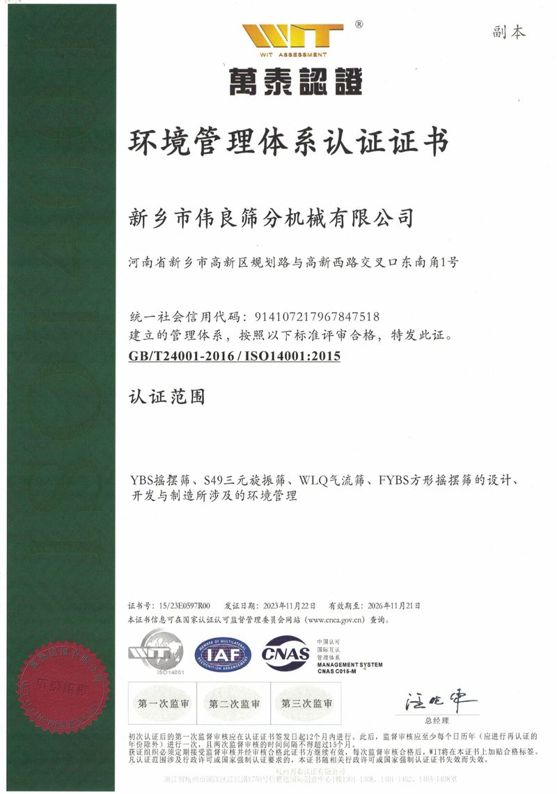 環(huán)境管理體系認證證書
